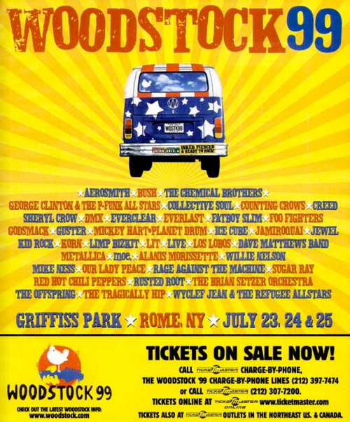 Wer in den Neunzigern aufgewachsen ist, hat potenziell einen Teil seiner musikalischen Sozialisation durch die Bands erfahren, die zum Billing von Woodstock ’99 gehörten. Denn das bildet das Jahrzehnt ab wie kaum ein anderes: So spielen Metallica, Limp Bizkit, Korn, The Roots, The Offspring, Moby, Ice Cube, Chemical Brothers, Rage Against The Machine, Fatboy Slim, Creed, Red Hot Chili Peppers und Everlast. Leider verhilft die Veranstaltung der Rock’n’Roll-Dekade auch zu einem äußerst unrühmlichen Ende.