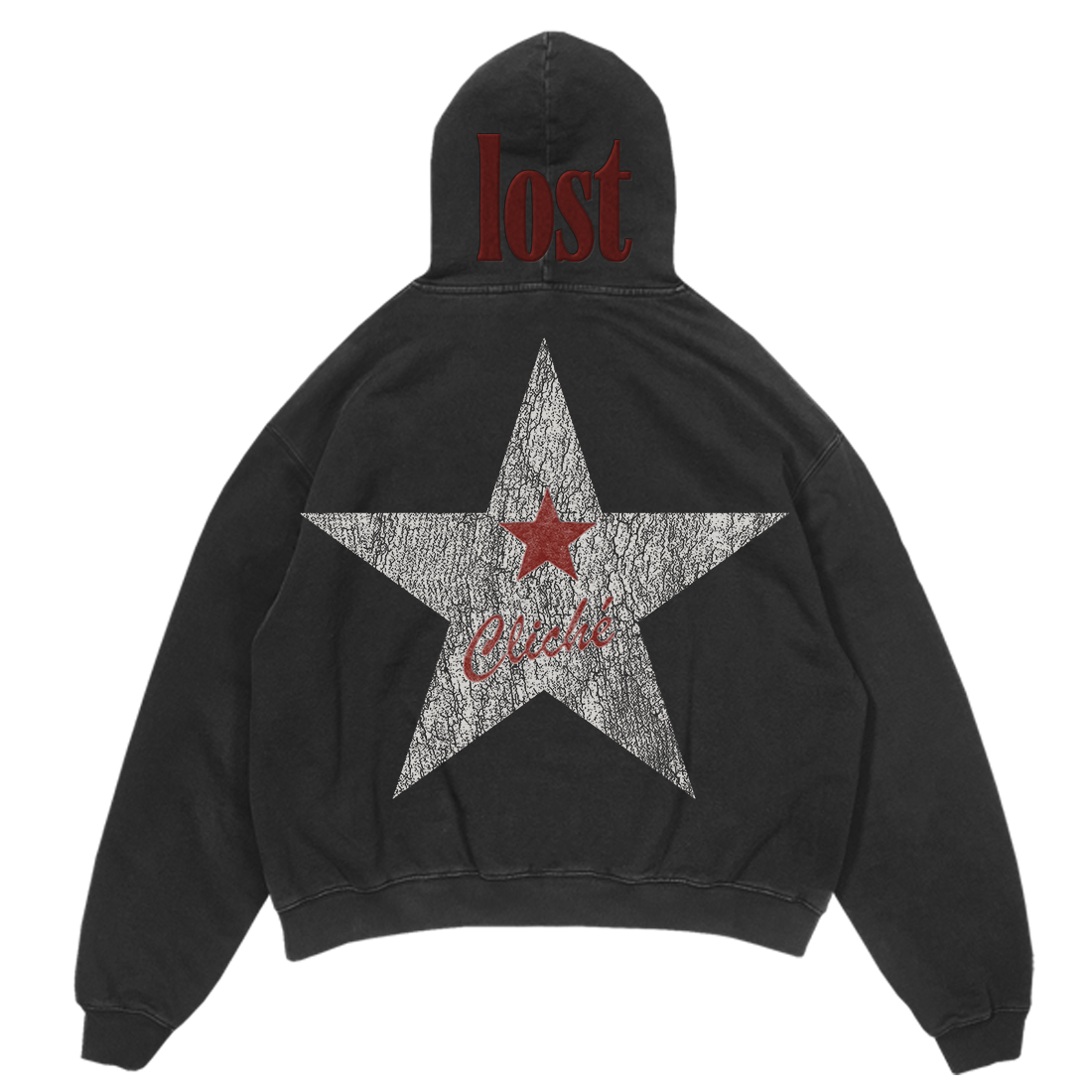 Schwarzer Hoodie mit Siebdruck auf der Rückseite, Filzlogo an der Kapuze und gewebtem Etikett auf der Vorderseite.