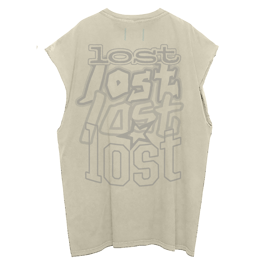 Cremefarbenes abgeschnittenes Tank mit Siebdruckgrafik auf der Vorder- und Rückseite.