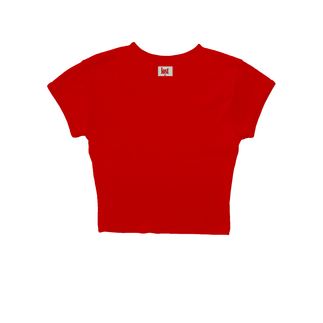 Rotes Cropped Baby-T-Shirt mit Siebdruck-Grafik auf der Vorderseite.