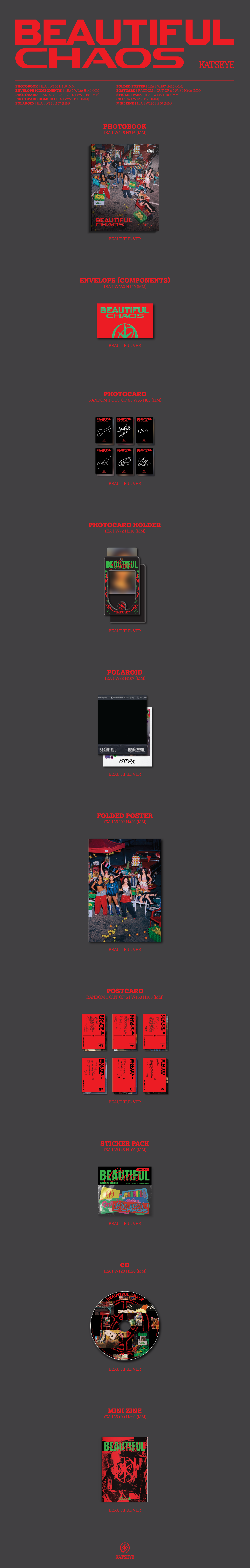 KATSEYE's 2nd EP, BEAUTIFUL CHAOS, via HYBE x Geffen Records, embraces the key message of "celebrating confusion." By incorporating a wide range of genres, the EP goes beyond any boundaries, expressing the chaos in various creative that comes with pushing the limits as an artist, while portraying KATSEYE's journey of growth. The six members of KATSEYE are: DANIELA (USA); LARA (USA); MANON (Switzerland); MEGAN (USA); SOPHIA (Philippines); and YOONCHAE (South Korea).