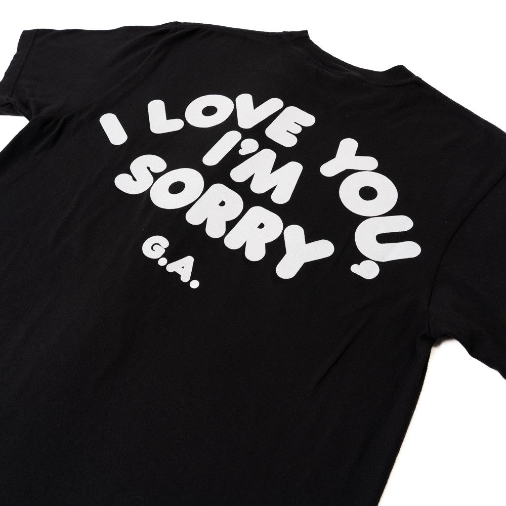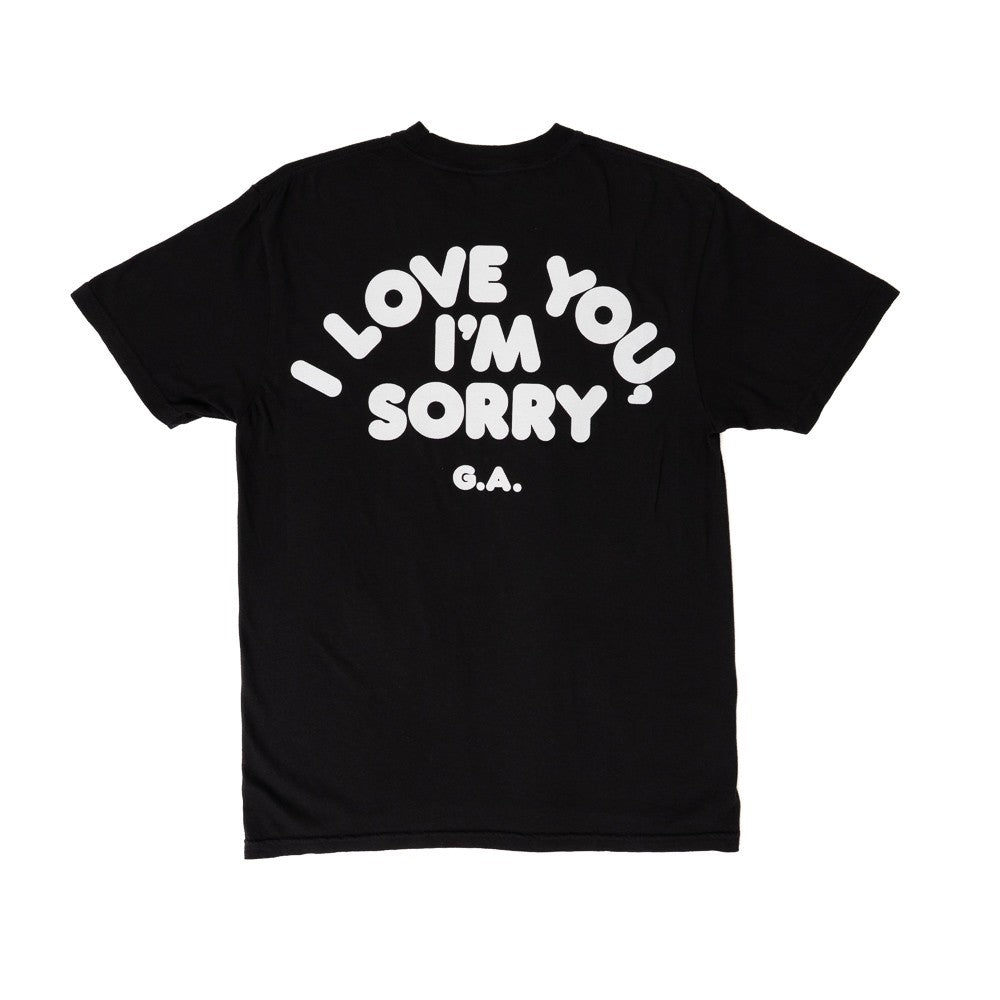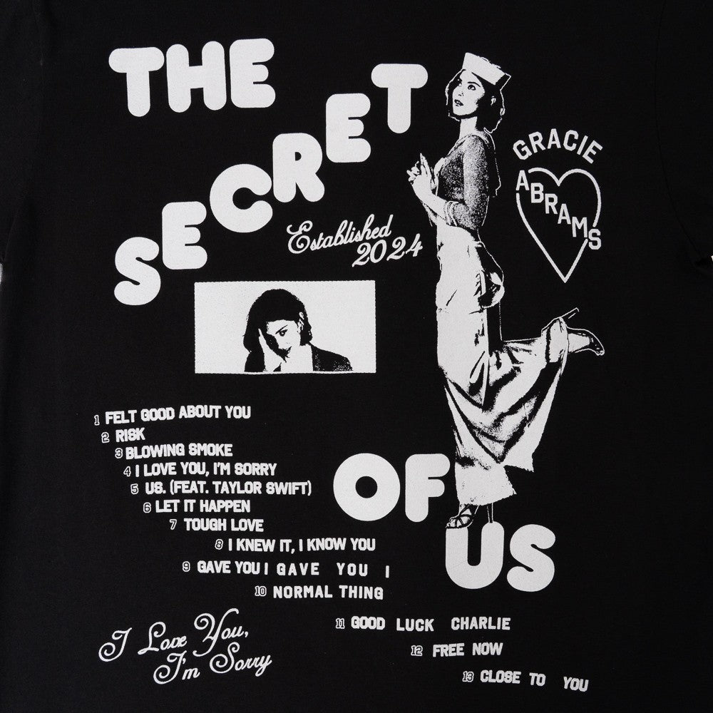 Schwarzes T-Shirt mit einem Foto von Gracie Abrams und dem Design des Albums The Secret of Us auf der Vorderseite sowie den Aufschriften „I Love You, I'm Sorry“ und „G.A.“ auf der Rückseite.