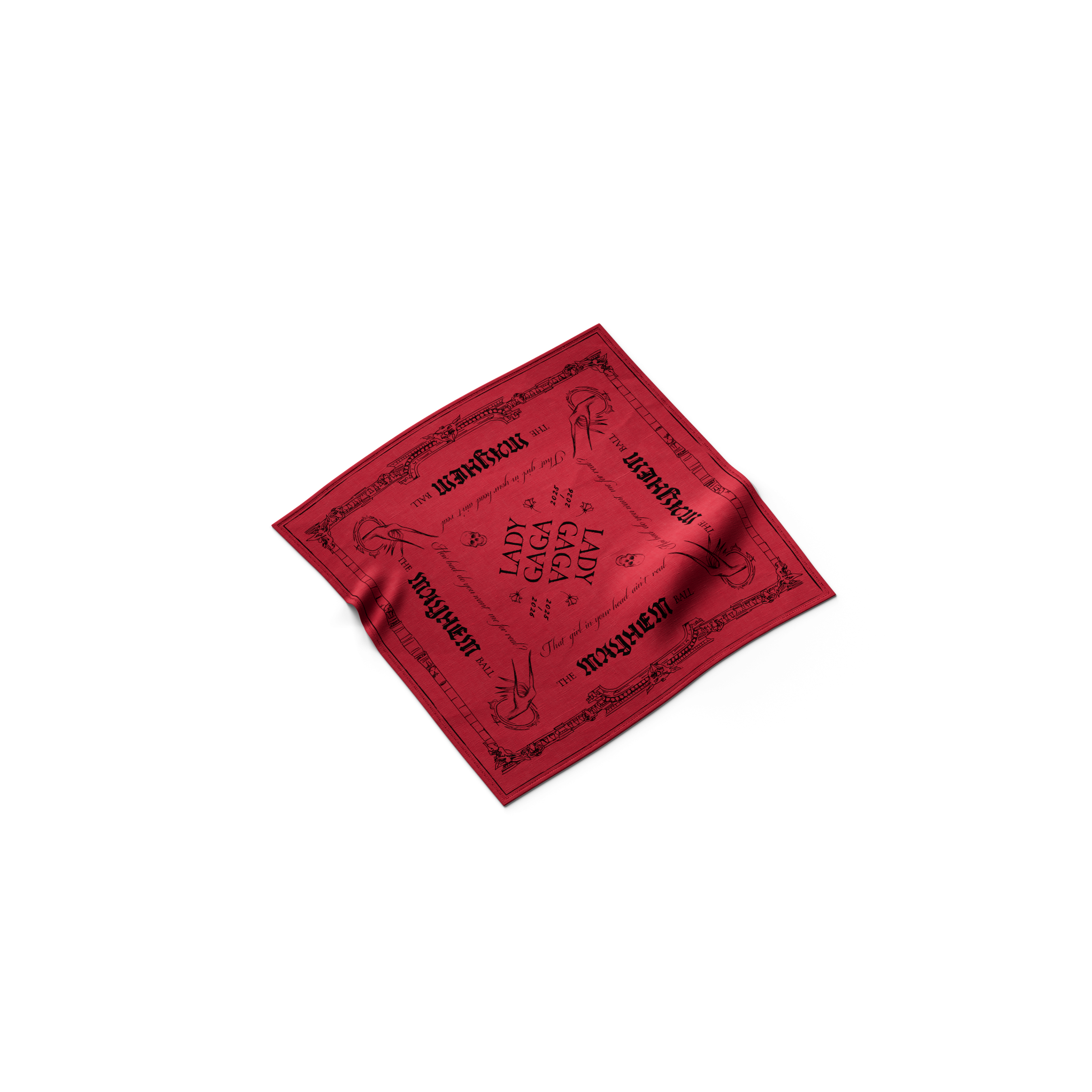 Rotes MAYHEM Bandana mit aufgedruckter Grafik.