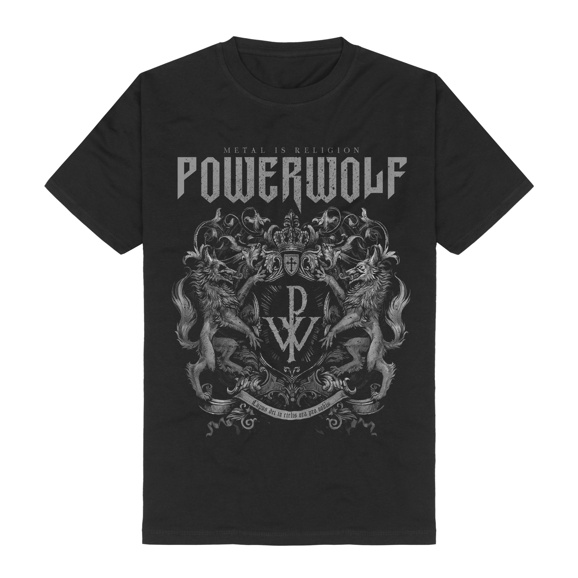 Powerwolf Crest T-Shirt in schwarz mit Crest Print auf der Vorder- und Rückseite. Normale Passform.